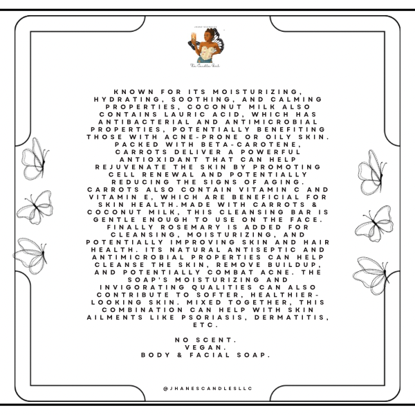 Known for its moisturizing, hydrating, soothing, and calming properties, Coconut Milk also contains Lauric acid, which has antibacterial and antimicrobial properties, potentially benefiting those with acne-prone or oily skin. Packed with beta-carotene, Carrots deliver a powerful antioxidant that can help rejuvenate the skin by promoting cell renewal and potentially reducing the signs of aging. Carrots also contain vitamin C and vitamin E, which are beneficial for skin health. Made with Carrots & Coconut Milk, this cleansing bar is gentle enough to use on the face. Finally, Rosemary is added for cleansing, moisturizing, and potentially improving skin and hair health. Its natural antiseptic and antimicrobial properties can help cleanse the skin, remove buildup, and potentially combat acne. The soap's moisturizing and invigorating qualities can also contribute to softer, healthier-looking skin. Mixed together, this combination can help with skin ailments like Psoriasis, Dermatitis, etc.