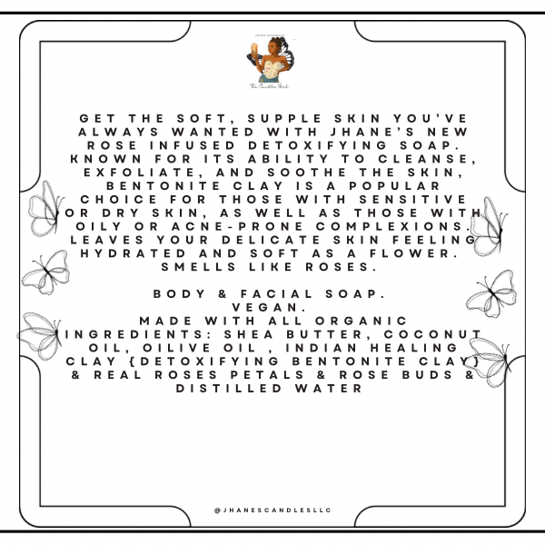 Get the soft, supple skin you’ve always wanted with Jhane’s NEW Rose Infused Detoxifying soap. Known for its ability to cleanse, exfoliate, and soothe the skin, Bentonite Clay is a popular choice for those with sensitive or dry skin, as well as those with oily or acne-prone complexions.